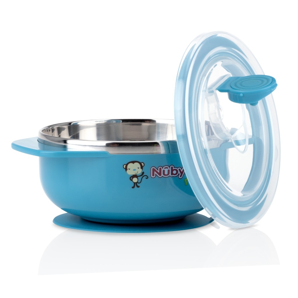 -Bát ăn giữ nhiệt Nuby kèm đế dính chống đổ cấu tạo 2 lớp với lớp bên trong là inox chống gỉ 304 siêu nhẹ, an toàn tuyệt đối. Lớp bên ngoài là chất liệu nhựa PP cao cấp, bền đẹp, cách nhiệt tốt. Bát ăn chống đổ