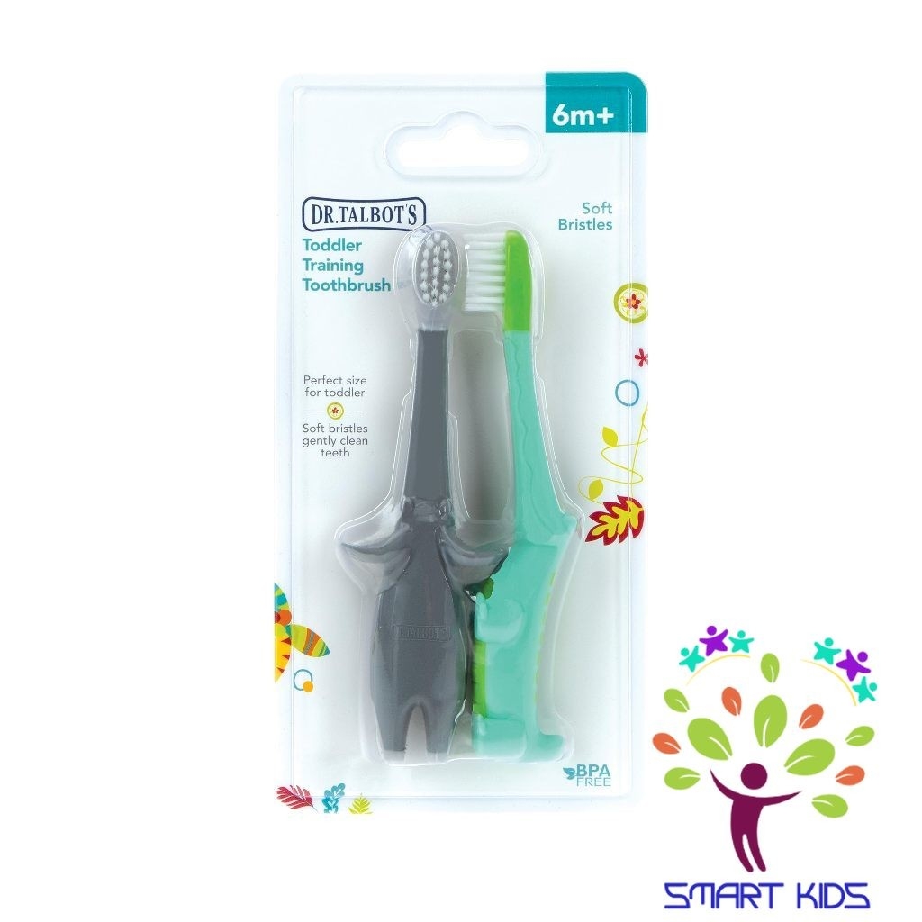 Bàn chải đánh răng Dr.Talbot's trẻ em cho bé từ 6 tháng trở lên ️Khi còn nhỏ, trẻ rất lười và sợ đánh răng, vì vậy bố mẹ cần đánh răng cùng bé, tập cho bé thói quen này hàng ngày để bảo vệ hàm răng sữa của bé tốt nhất. Việc lựa chọn cho bé một chiếc bàn chải đánh răng phù hợp với sở thích của các bé cũng là yếu tố tạo nên sự hứng thú cho bé yêu mỗi khi vệ sinh răng miệng. Bàn chải đánh răng trẻ em hình con cá sấu và con voi dành cho bé từ 6 tháng tuổi trở lên Bàn chải đánh răng được làm từ chất liệu nhựa PP cao cấp không BPA cùng với lớp lông siêu mềm mại nên rất an toàn cho những chiếc răng sữa của các bé. Tay cầm của bàn chải nhẵn mịn không góc cạnh, không làm ảnh hưởng đến làn da tay nhạy cảm của bé khi sử dụng. +Thiết kế độc đáo - Bàn chải đánh răng có đầu thuôn tròn, dễ dàng đưa vào khoang miệng còn nhỏ và không làm đau, xước hàm của bé. Cổ bàn chải tròn và nhỏ, giúp bàn chải dễ dàng đưa vào trong để đánh sạch cả mặt trong của răng và những ngóc ngách sâu trong hàm. - Đầu lông bàn chải mảnh và mềm, dễ dàng làm sạch các kẽ và chân răng, loại bỏ mảng bám thức ăn, ngăn ngừa sâu răng, giúp răng luôn trắng sáng mà không làm ảnh hưởng đên lợi của bé.