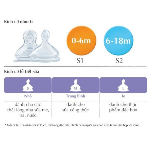 Cỡ S: dùng cho nước hoặc sữa mẹ; Cỡ M: dùng cho sữa bột; Cỡ L: dùng cho bột hoặc thức ăn đặc.