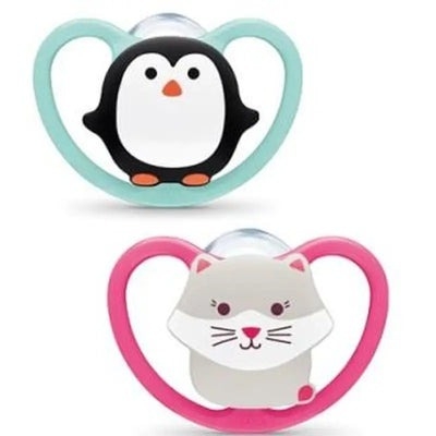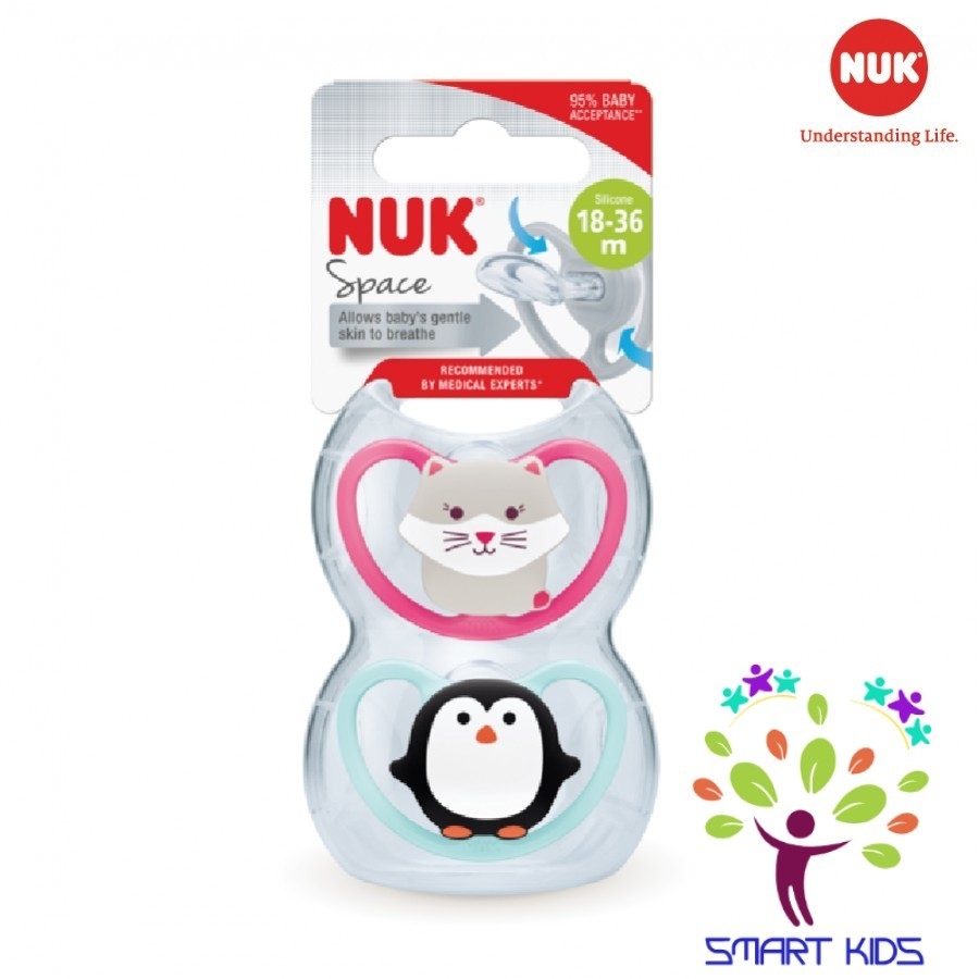 Ti giả NUK Space, một cải tiến cực kì thân thiện cho làn da mỏng manh và nhạy cảm của bé, nhằm giúp da bé được hít thở tự nhiên và thoải mái. Thiết kế mô phỏng chân thực núm vú mẹ được 95% em bé chấp nhận và 100% bác sĩ chỉnh nha khuyên dùng.