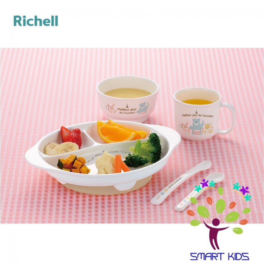 Bộ ăn dặm 7 món chống đổ Richell có thiết kế họa tiết gấu, thỏ, cáo dễ thương. Lòng bát, cốc, khay ăn láng mịn hạn chế tối đa các mảng thức ăn bám vào giúp việc làm sạch trở nên nhanh chóng.