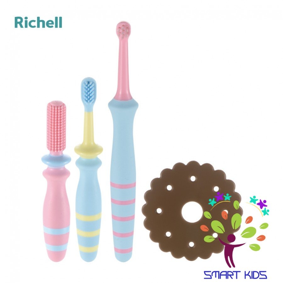 Bộ sản phẩm bao gồm: Bàn chải bước 1, bàn chải bước 2, bàn chải bước 3 và 1 khiên bảo vệ, đáp ứng cho từng giai đoạn phát triển răng lợi của trẻ: mọc những chiếc răng đầu tiên - mọc nhiều răng - mọc răng hàm trong