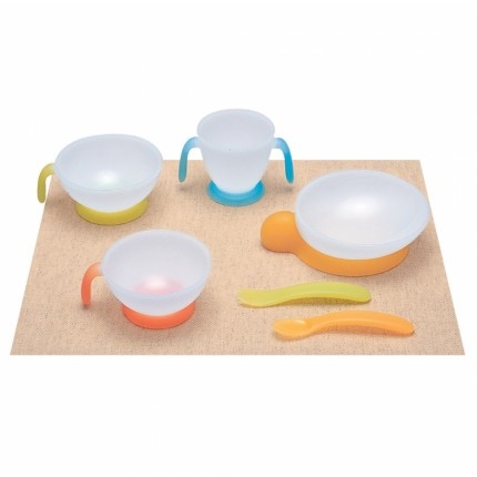 Bộ đồ tập ăn bước 2 gồm: bát ăn, đĩa, dĩa và thìa.