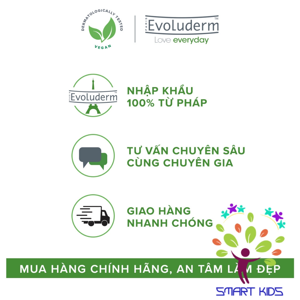 Evoluderm là dòng sản phẩm an toàn với làn da, tất cả sản phẩm đều được sản xuất tại Pháp theo quy trình nghiệm ngặt và tuân thủ mọi nguyên tắc an toàn với da liễu. Vui lòng tham khảo kĩ và cân nhắc trước khi sử dụng nếu da bạn nhạy cảm với một trong những thành phần của sản phẩm.