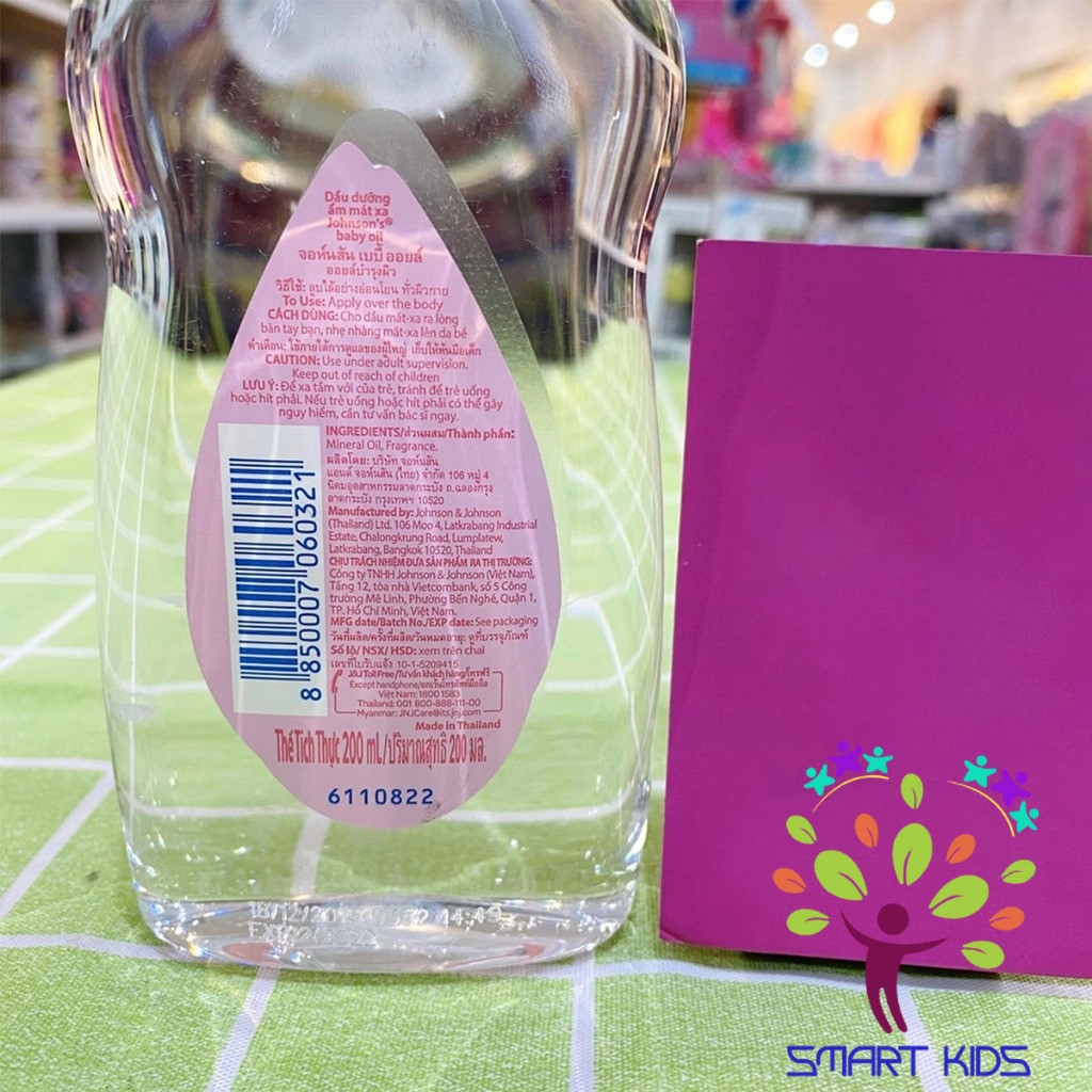 Dầu Mát Xa Em Bé Johnson's Baby Dưỡng Ẩm, Làm Mềm Da - Johnson's Baby Oil Pink 200ml - Thương hiệu: Johnson's - Nơi sản xuất: Thái Lan - Dung tích: 200ml - Johnson&Johnson là thương hiệu đến từ Mỹ với hơn 130 năm kinh nghiệm, nghiên cứu và sản xuất các sản phẩm chăm sóc sức khỏe. Johnson&Johnson tự hào là công ty chăm sóc sức khỏe hàng đầu trên thế giới. Chúng tôi Cam kết phát triển các sản phẩm chăm sóc bé chất lượng cao và chỉ sản xuất các sản phẩm mà chúng tôi sẽ sử dụng cho chính gia đình mình. Rất hữu hiệu khi dùng để mát-xa cho bé, nhằm giảm sự ma sát lên làn da mỏng manh của bé, quy trình mát-xa có tác dụng giúp trẻ tiêu hóa tốt, giúp xương bé thêm chắc khỏe, dẻo dai. Sản phẩm có khả năng khóa ẩm hoàn hảo, cấp ẩm cho những vùng da bị khô, không gây nhớt khó chịu, được chứng minh lâm sàn với tính năng nhẹ dịu cho làn da của bé. Thành phần chế tạo từ dầu khoáng tự nhiên và mùi hương không gây kích ứng cho khướu giác CÔNG DỤNG: - Mát-xa giúp máu lưu thông tốt, ăn ngon miệng và ít táo bón, thúc đẩy sự hoàn thiện hệ thống miễn dịch giúp trẻ phòng chống bệnh tất - Mát-xa làm cho các cơ săn chắc, hệ thống xương khớp dẻo dai - Dùng để dưỡng ẩm khi da rất khô, hoặc vùng cùi chỏ, đầu gối. Duy trì chức năng bảo vệ da. Lưu ý: Dể ngoài tầm tay trẻ em Hướng dẫn sử dụng: Mát xa trước khi tắm làm ấm cơ thể bé. Hạn sử dụng: 3 năm kể từ ngày sản xuất