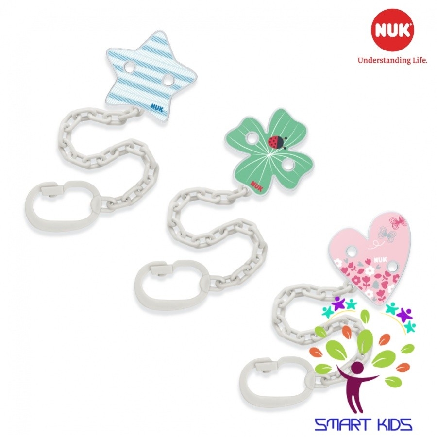• Công dụng: Giữ ti giả luôn vệ sinh và không bị thất lạc trong quá trình sử dụng (móc xích gắn vào vòng cầm tay của ti giả và cài đầu cặp tròn của dây đeo lên áo bé, thường là cổ áo).
