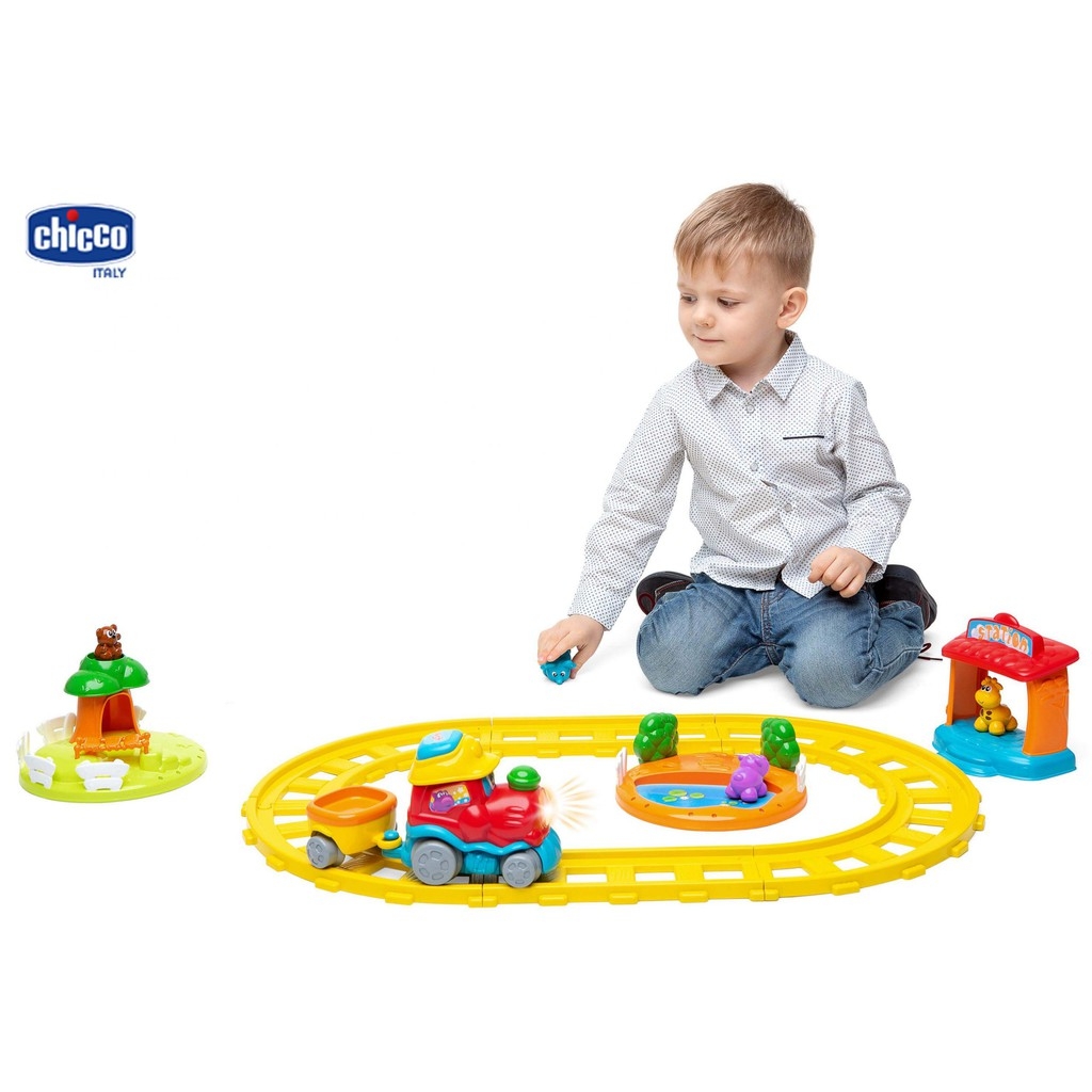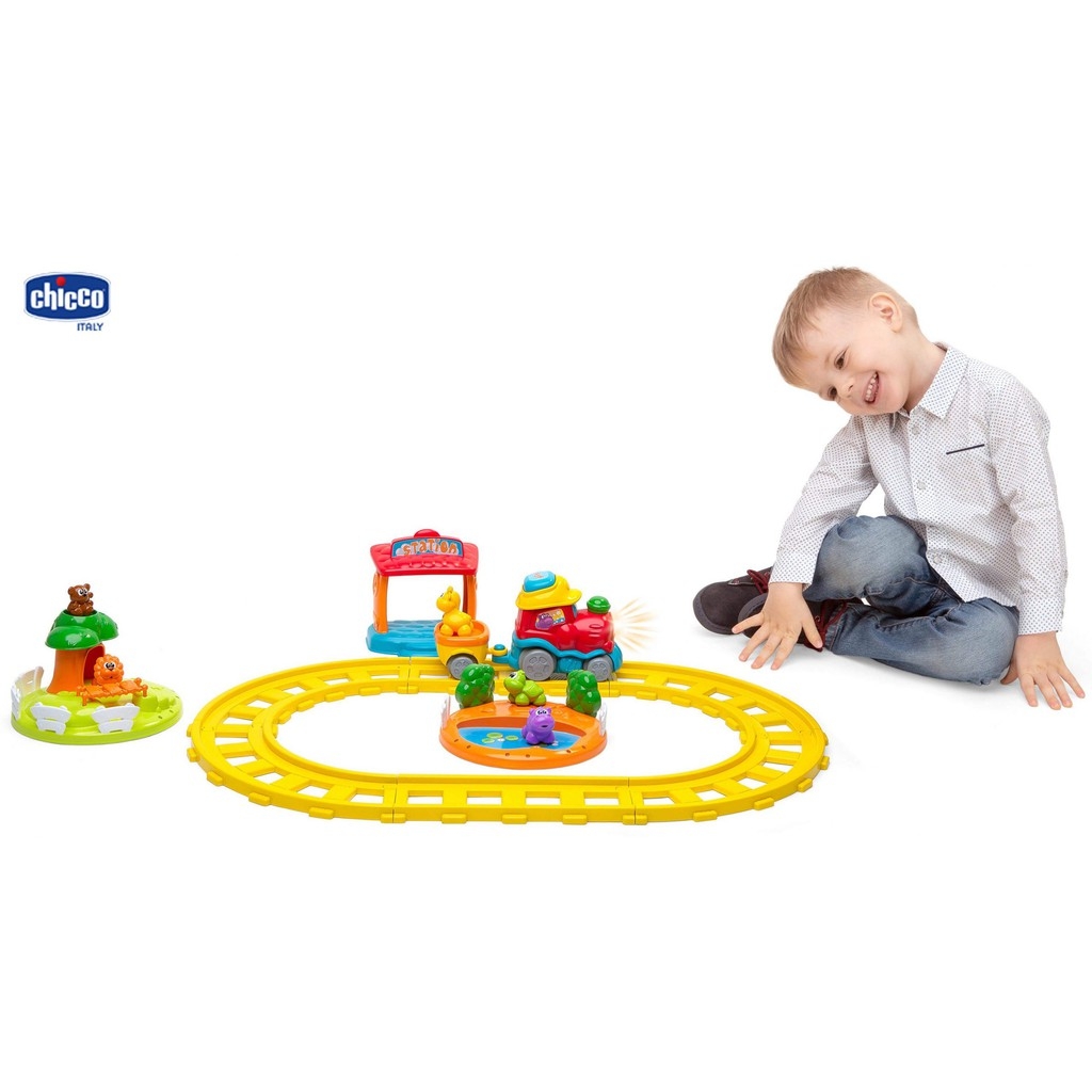 Đồ chơi gồm: Bộ đường ray, đoàn tàu (Đầu tàu và toa chở khách), 6 con vật (Voi, Hươu cao cổ, Hà mã, Sư tử, Gấu, Rùa), nhà chờ Station, mô hình hồ nước và mô hình đất liền.