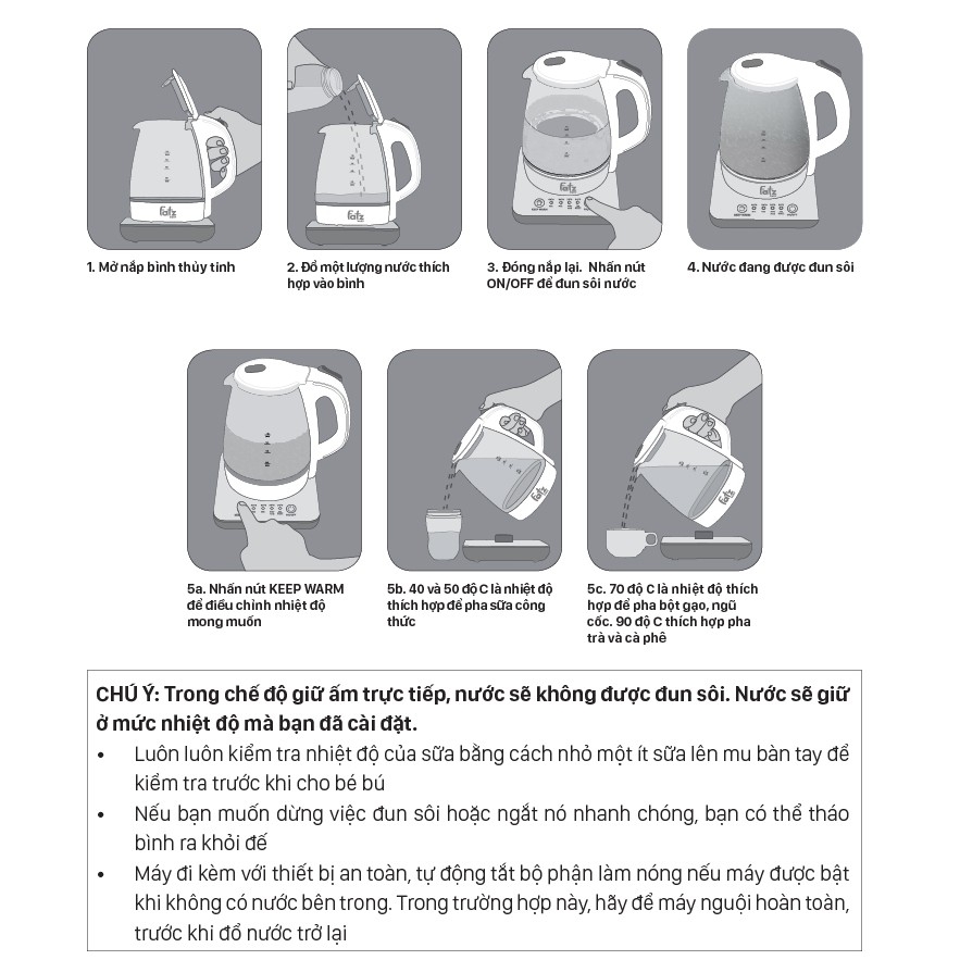 Đun sôi nước siêu tốc trong vòng 5 phút (Nước ở nhiệt độ phòng khoảng 20o C) . 4 cấp độ giữ ấm 40o C - 50o C - 70o C - 90o C: 40o C & 50o C để pha sữa; 70o C để pha bột, ngũ cốc... 90o C để pha trà và cà phê...