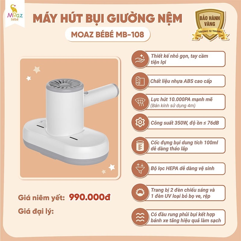 Máy hút bụi giường nệm Moaz BéBé MB – 108 có kiểu dáng nhỏ gọn, lực hút mạnh mẽ ≥10Kpa, và tích hợp đèn UV nên có khả năng loại bỏ bụi bẩn lẫn những vi khuẩn, nấm mốc gây hại bám trên bề mặt vật dụng như chăn, gối, nệm, ….. Máy thích hợp để sử dụng cho gia đình có con nhỏ. Sản phẩm hoạt động bằng một nút bấm duy nhất, tiện lợi cho ba mẹ sử dụng.