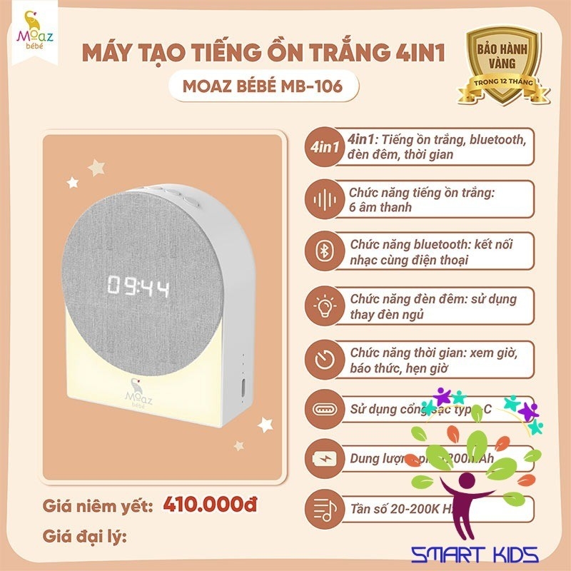 Máy tạo tiếng ồn trắng 4 trong 1 Moaz BéBé MB – 106 là thiết bị phát ra 6 cấp độ âm thanh đặc biệt, mô phỏng các âm thanh trong tự nhiên, lặp đi lặp lại để ngăn cản sự phiền nhiễu từ tiếng ồn xung quanh. Sản phẩm giúp mẹ và bé được thư giãn, dễ dàng đi vào giấc ngủ. Bên cạnh đó, máy tích hợp các chức năng hẹn giờ, báo thức, … giúp mẹ xây dựng giấc ngủ khoa học cho con yêu.