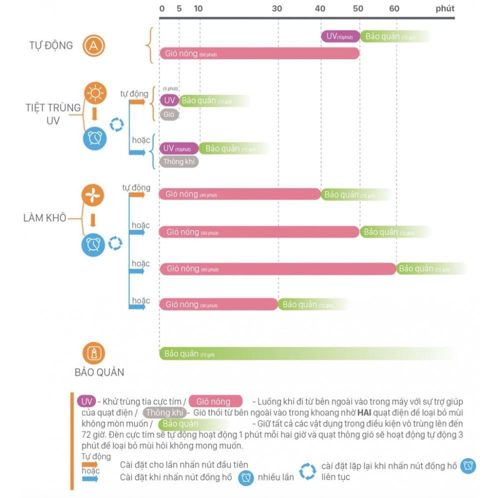 👉 4 Chế độ TỰ ĐỘNG / TIỆT TRÙNG / SẤY KHÔ / BẢO QUẢN: Với một máy thông thường chỉ là tiệt trùng thì với máy UV bạn có thể thực hiện cả 2 chức năng tiệt trùng và sấy khô theo 4 chu trình hoạt động khác nhau: