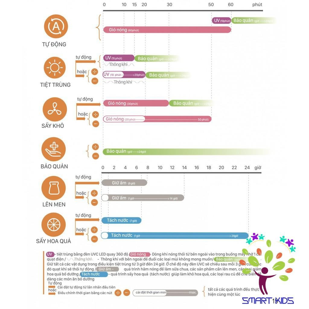 Tiệt trùng sâu và triệt để bằng 6 đèn LED UVC quay 360 độ: đây là công nghệ tiệt trùng bằng tia UV mới nhất của dòng tiệt trùng FATZBABY Tại sao có tên gọi UVC, UVC có bước sóng ngắn ~ 254nm, đây là khoảng bước sóng cực tím lý tưởng để tiêu diệt vi trùng và vi khẩn. Việc tiệt trùng phụ thuộc vào khả năng chiếu của tía UV tới các bề mặt của vật thể, vì vậy khi đèn chiếu quay 360 độ sẽ đảm bảo thời gian nhanh nhất để các tia cực tím đi vào các ngõ ngách của các vật thể và chạm tới các bề mặt một cách nhanh nhất. Chính vì vậy với bộ 6 đèn LED sẽ mang lại hiệu quả hơn so với đèn UV tuýp thông thường. Ngược lại tổng công suất chỉ tới 5 W, UVC LEDs sẽ tiêu thụ điện ít hơn và có tuổi thọ cao hơn so với đèn tuýp. Bạn có thể sử dụng đèn LED vĩnh viễn mà không cần thiết phải thay đèn như các loại máy tiệt trùng UV thông thường khác. Bộ 6 đèn UVC-LED được FATZBABY bảo hành lên tới 3 năm. 1. THIẾT KẾ & CÔNG DỤNG Trang bị quạt thông gió luôn hoạt động cùng với đèn UV để loại bỏ mùi hôi không mong muốn: việc thông khí luôn rất cần thiết, vì đối với tiệt trùng UV bạn sẽ luôn cảm thấy có mùi hơi khó chịu, đó là do bản chất của tia UV gây ra. Quạt gió sẽ hoạt động liên tục trong thời gian tiệt trùng để có thể loại bỏ phần lớn mùi không mong muốn này. Thể tích lớn 17 L có thể chứa 12 bình cổ rộng: Với thể tích này mẹ sẽ không còn phải lo lắng khi qúa nhiều vật dụng cần tiệt trùng cùng một lúc, đôi lúc 1 con gấu bông cũng có thể để vưà trong máy tiệt trùng. Lõi máy được làm bằng thép không gỉ siêu gương với cấu tạo đặc biệt để tối đa hóa khả năng phản xạ tia UV. Lọc khí bằng than hoạt tính, giúp ngăn ngừa khí độc và khí ô nhiễm: Lọc khí sẽ được đặt ở cửa khí vào và ra đảm bảo khí trong máy tuyệt đối sạch không nhiểm bụi cũng như các chất độc hại trong không khí Điều khiển màn hình LED bằng các nút cảm ứng: Hiện đại của máy thể hiện ở màn hình LED màn hình có thấy rõ icon chức năng để thuận tiện cho việc điều khiển. 6 Chế độ TỰ ĐỘNG/TIỆT TRÙNG/SẤY KHÔ/BẢO QUẢN/LÊN MEN/SẤY HOA QUẢ: máy UVC-LED đã tích hợp 2 chức năng vô cùng mới cho các mẹ bỉm sữa đó là giữ ấm để chế biến các món ăn lên men, và sấy nhẹ để làm hoa quả sấy cho bé 1. Sấy khô và tiệt trùng tự động 2. Sấy khô mà không tiệt trùng 3. Tiệt trùng mà không sấy khô 4. Bảo quản 24h: tiệt trùng bằng 2 phút tia UV sau mỗi 3 giờhoạt động 5. Chức năng LÊN MEN giúp chế biến các món ăn bổ dưỡng như sữa chua, giấm. 6. SẤY HOA QUẢ (hay còn gọi là tách nước) để chế biến hoa quả sấy cho bé