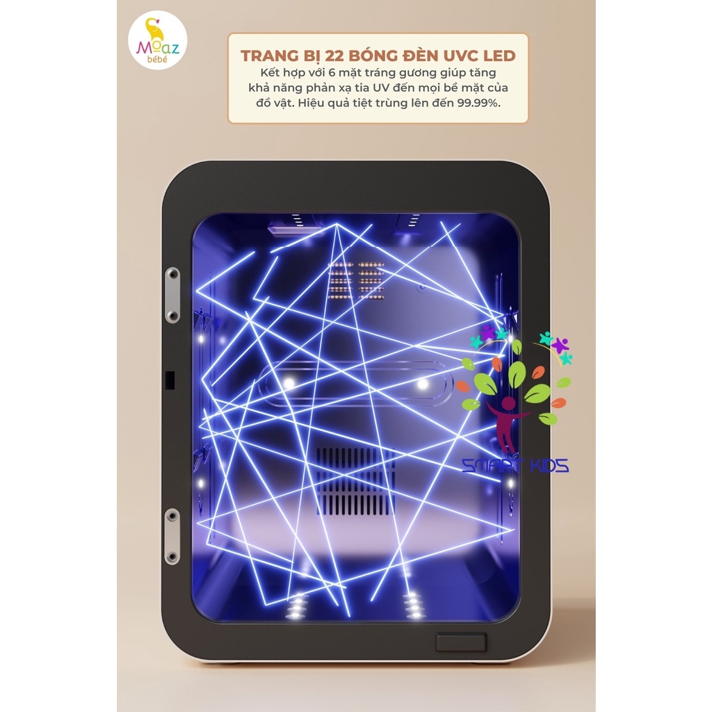 Máy tiệt trùng phiên bản cao cấp nhà Moaz Bé Bé trình làng với công nghệ tiệt trùng bằng 22 đèn UVC kết hợp cùng công nghệ tiệt trùng plasma (i-on), phân hủy các loại khí và vi khuẩn có hại hiệu quả 99,99%.