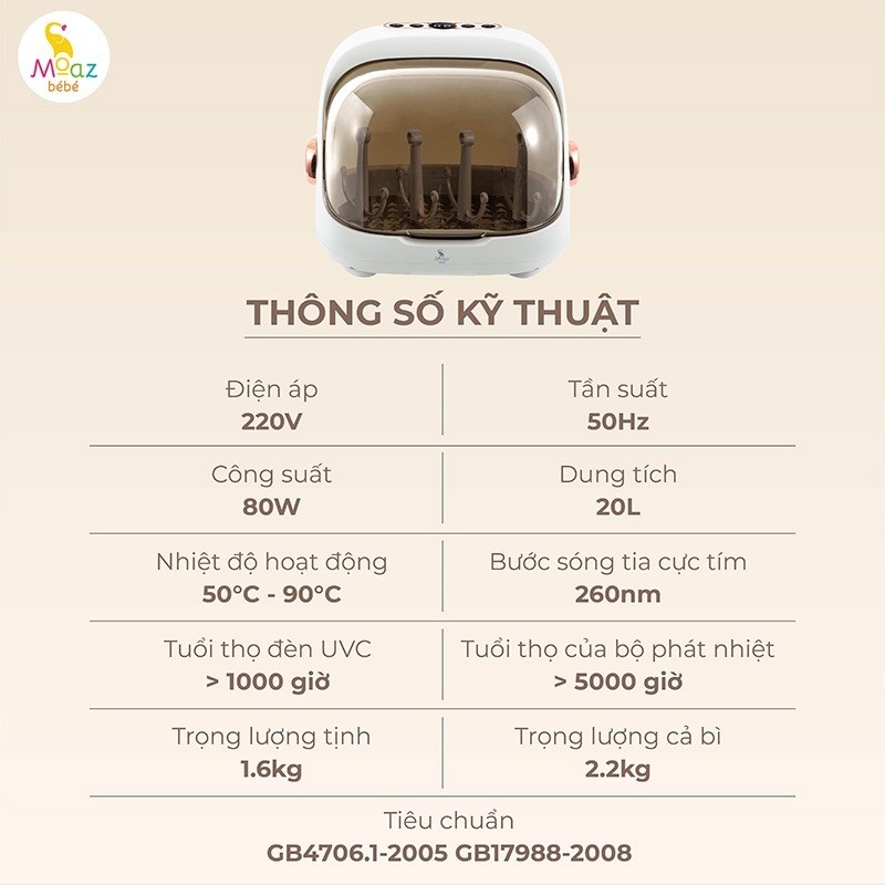 Thông số kỹ thuật máy úp bình sữa, tiệt trùng sấy khô tia UVC Moaz BéBé MB044 Plus