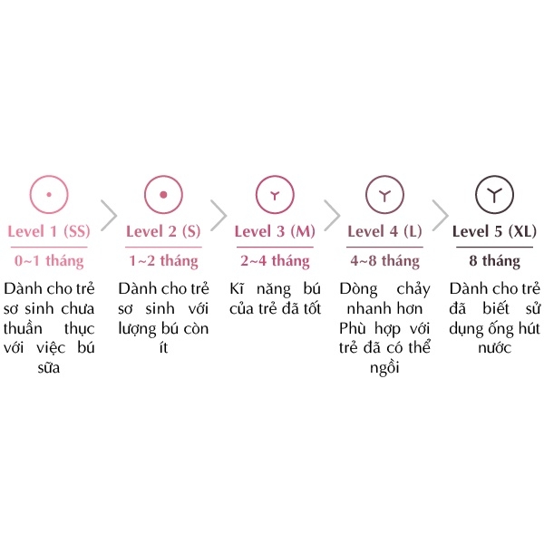 Núm ti bình sữa PPSU Mother-K được phân chia dựa trên các nghiên cứu về sự phù hợp với từng giai đoạn tăng trưởng, khả năng bú nuốt và lượng ăn của bé.