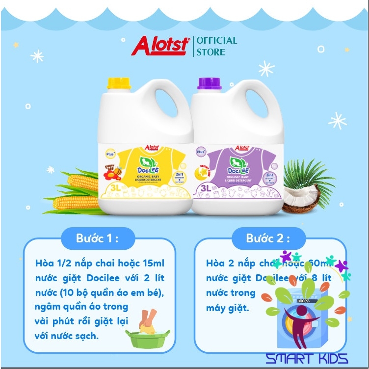 SẢN PHẨM MỚI! THƠM HƠN LƯU HƯƠNG LÂU HƠN! Dung dịch giặt xả quần áo em bé organic Docilee cải tiến mạnh mẽ hơn với thành phần tự nhiên từ dầu Dừa, bột Ngô có PH trung tính, giúp giữ quần áo không bị hư hại trong quá trình giặt và an toàn với da tay. Công thức đặc biệt có thể chống khuẩn, loại bỏ vết bẩn và dầu mỡ cứng đầu nhất mà không hề sử dụng thành phần tẩy, nhuộm, chất làm sáng quang học hay mùi hương tổng hợp. Sản phẩm thêm thành phần xả cho quần áo mềm mại, không gây kích ứng da bé. Hương thơm tự nhiên lưu lâu trên quần áo giúp bé chơi ngoan và ngủ ngon hơn. Sản phẩm thân thiện với Môi trường, không độc hại. Lý tưởng để giặt quần áo người lớn có da nhạy cảm. Cách sử dụng: Giặt tay: - 1. Hòa ½ nắp chai hoặc 15ml dung dịch giặt xả quần áo em bé 2in1 Docilee với 2 lít nước (dùng giặt cho 10 bộ quần áo trẻ em) – 2. Ngâm quần áo trong vài phút – 3. Giặt lại với nước sạch – Giặt máy: Hòa 2 nắp chai hoặc 60ml dung dịch giặt xả quần áo em bé 2in1 Docilee với 8 lít nước trong máy giặt. Thể tích thực: 1 Lít Bảo quản: Để nơi khô ráo, thoáng mát. Lưu ý: Cách xa tầm tay trẻ em. Nếu sản phẩm rớt vào mắt thì xả kỹ với nước. Nếu nuốt phải thì uống thật nhiều nước. Xin tư vấn của bác sỹ nếu cần Hạn sử dụng: 3 năm kể từ ngày sản xuất được in trên bao bì Sản xuất tại: Thái Lan