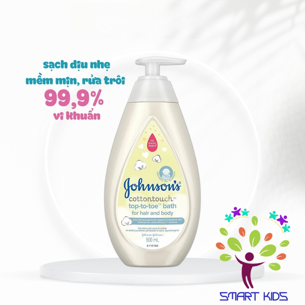 Sữa Tắm Gội Cho Bé Johnson's Baby Làm Sạch Dịu Nhẹ, Dưỡng Ẩm - Johnson's Top-To-Toe Bath Cotton Touch - Xuất xứ thương hiệu: Mỹ - Sản xuất tại: Malaysia - HSD: 3 năm từ NSX TÍNH NĂNG NỔI BẬT Sữa tắm toàn thân Johnson's Top-To-Toe Bath Cotton Touch có tác động rất dịu nhẹ lên làn da nhạy cảm của trẻ sơ sinh. Làn da bé mỏng hơn tới 30% so với da người lớn, do đó cần được nâng niu chăm sóc đặc biệt. - Công thức có chứa sợi bông 100% đến từ thiên nhiên - Dành riêng cho làn da nhạy cảm của trẻ sơ sinh - Giúp làn da sạch và mềm mại - Dễ dàng rửa sạch, không bám rít (so với da người lớn) - Không chứa paraben, phthalate hoặc thuốc nhuộm. Hypoallergenic - Ít gây k.í.ch ứ.ng da - Không gây cay mắt - Duy trì độ ẩm cho da bé - Giúp cân bằng độ pH Đối tượng : Dành cho trẻ nhỏ và bé sơ sinh. Hướng dẫn sử dụng: Làm ướt tóc và người bé bằng nước ấm, tắm cho bé bằng tay hoặc khăn mặt, xoa nhẹ nhàng và rửa sạch. CẢNH BÁO: Sử dụng dưới sự giám sát của người lớn LƯU Ý: Để xa tầm tay trẻ em BẢO QUẢN: Bảo quản ở nơi khô ráo, thoáng mát, tránh ánh nắng trực tiếp