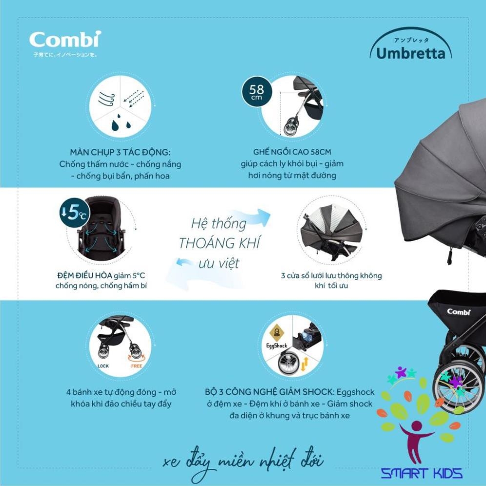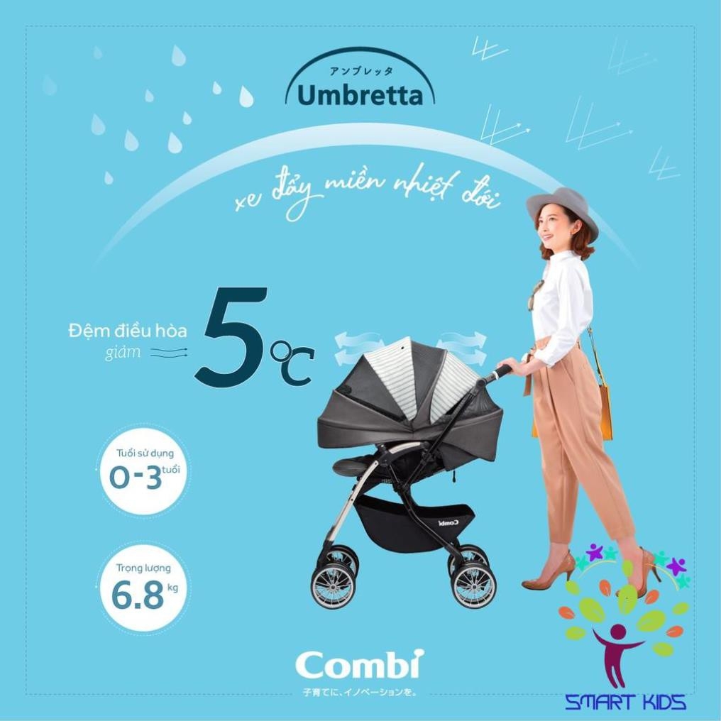 Umbretta – Xe đẩy miền nhiệt đới – hội tụ đỉnh cao công nghệ Combi - Bảo vệ bé toàn diện 360° - 365 ngày. Phiên bản Premium với màu đen sang trọng cùng thiết kế mới ở màn chụp, túi phủ chân, giỏ đựng đồ cùng họa tiết ton sur ton mang lại sự tinh tế trong từng đường nét.